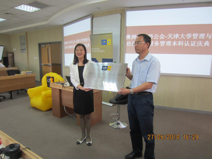 澳洲会计师公会北京代表处首席代表王瑾女士向8040威尼斯管理与经济学部副主任杨宝臣颁授香港澳洲会计师公会认证证书